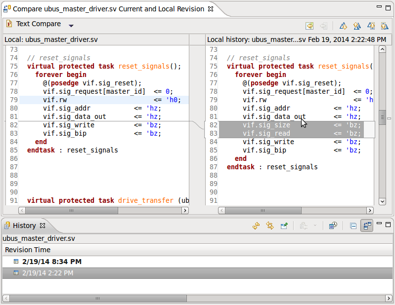 To quote from the platform manual: “A local edit history of a file is maintained when you create or modify a file. Each time you edit and save the file, a copy is saved so that you can replace the current file with a previous edit or even restore a deleted file. You can also compare the contents of all the local edits. Each edit in the local history is uniquely represented by the date and time the file was saved. Only files have local history; projects and folders do not.”